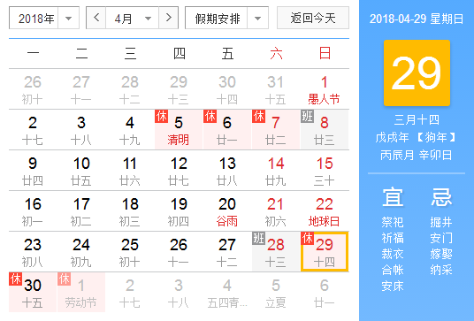 4月29日(星期天)至5月1日(勞動節(jié),星期二)放假調(diào)休,共3天。