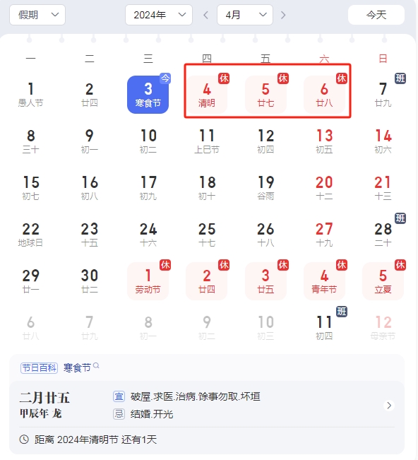 2024年清明節(jié)放假時間安排: 4月4日(星期四)至4月6日(星期六)放假調(diào)休,共3天。4月7日(星期日)上班。