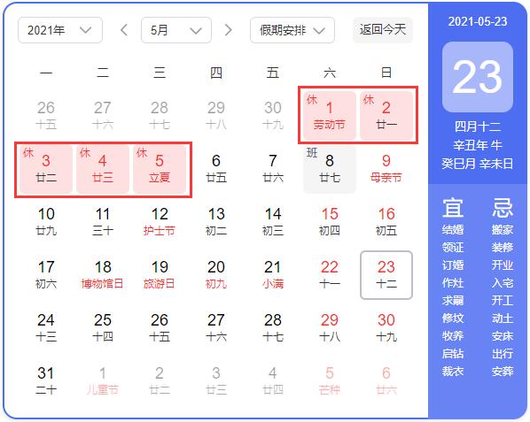 4月24日(星期六)放假,4月25日(星期日)上班;5月1日(星期六)至5日(星期三)放假調休,共5天。
